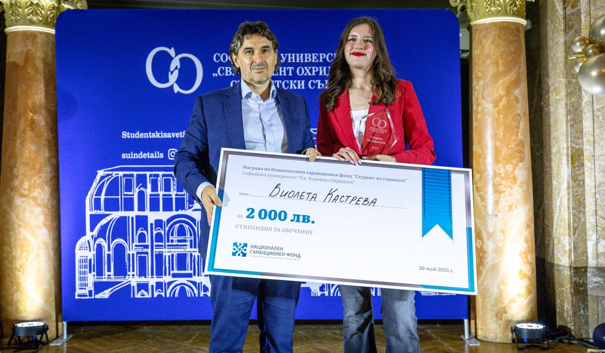 Заместник-председателят на Съвета на директорите и изпълнителен директор на НГФ Тодор Тодоров връчи голямата награда – стипендия за обучение на стойност 2000 лв., на носителя на отличието „Студент на годината“ за 2025 г. Виолета Кастрева.